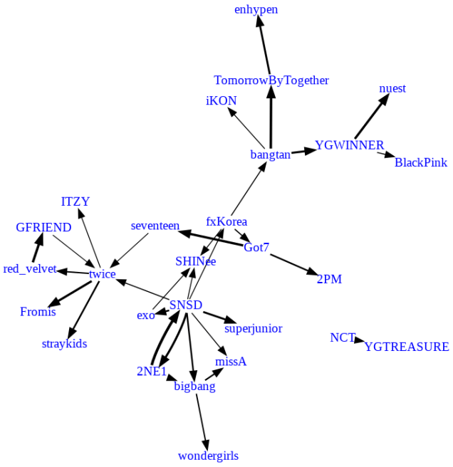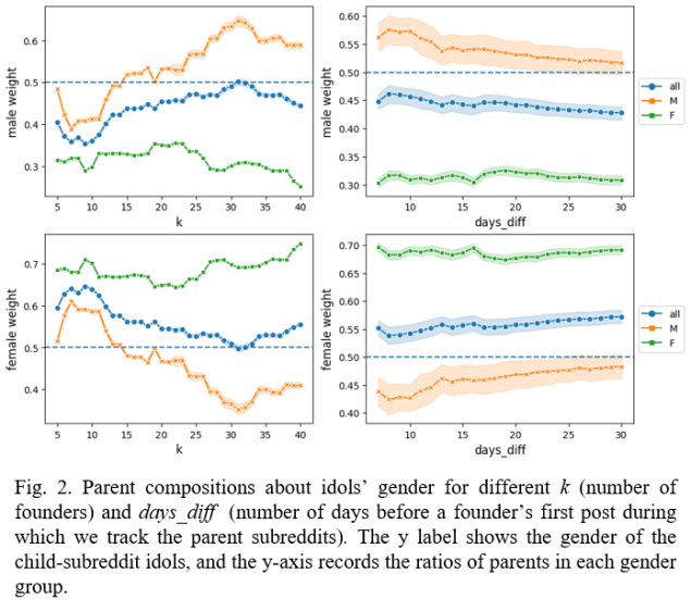 In recent years, the impact of Korean pop (k-pop) idols has hugely changed the ecosystem of the western entertainment industry. Online communication among k-pop fans has been playing an essential role in this promotion. This project explores such interactions among the fandom communities of idol groups from the top companies (SM, JYP, YG, and HYPE) on Reddit. Motivated by Tan’s idea of community genealogy, this research captures the emergence of new fandom subreddits by tracing the posting history of founders, the first k members in a new community. The genealogical structure among the fandom groups is represented as a weighted directed network. Based on this network, this research characterizes the member flows between parent and children subreddits. An interesting finding is that while the inclusion of newcomers tends to balance the distribution of a subreddit’s members in terms of the generation and company affiliation of their interested idol groups, it intensifies the homophily based on their idols’ gender. Besides, the study shows that strong connections to relatives, diversified founder backgrounds, and founders’ active involvement (i.e., posting frequency) contribute to the growth speed of a fandom community.